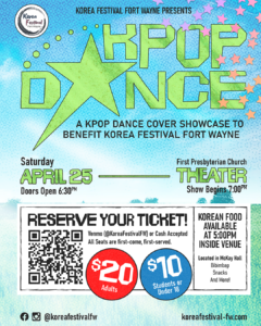 Join us for an evening with K-Pop, a benefit to support Korea Festival Fort Wayne! The event is sponsored by the FPC Korean Language Ministry and will be held at First Presbyterian Theater! Donations are encouraged and all proceeds will support Korea Festival Fort Wayne!